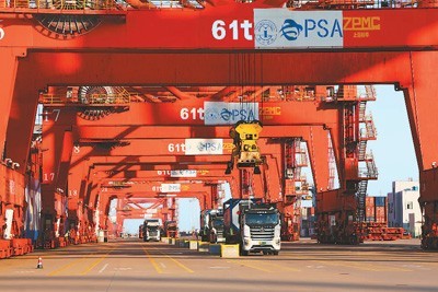 货轮停靠连云港港口后,集装箱通过“船车直取”的模式,被直接吊装上短驳车,分流至中哈(连云港)物流合作基地,货物集结后被装上火车,运往中亚、欧洲等国家和地区。