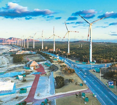 在山东省荣成市北部沿海风力发电场,风力发电机组不断输送绿色能源,与晚霞、大海交相辉映,构成一道靓丽的海岸风景线。