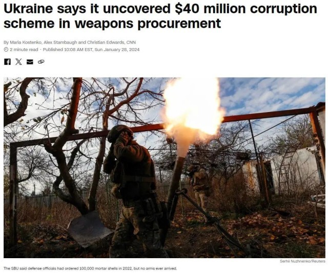 无独有偶,乌克兰独立新闻社28日爆料称,乌克兰国家安全局27日宣布,乌克兰军方与利沃夫兵工厂于2022年8月签订合同,采购10万枚迫击炮弹,合同金额约为15亿格里夫纳。军方按照合同提前把采购款拨给了利沃夫兵工厂。但乌军方却连一枚炮弹都没收到,而采购款被转至乌克兰境内外多个账户中。目前,炮弹采购款已经被追回。5名涉案嫌疑人被指控企图侵吞军火采购款,其中一人在企图外逃时被截获,他们将面临最长12年的监禁和没收财产的处罚。