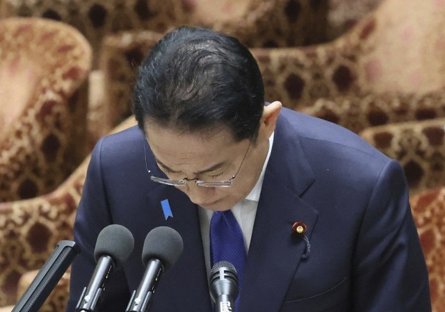 当地时间2024年1月29日,日本东京,日本首相岸田文雄在国会大厦出席众议院预算委员会时鞠躬,此次会议的目的是讨论自民党的政治和资金丑闻。