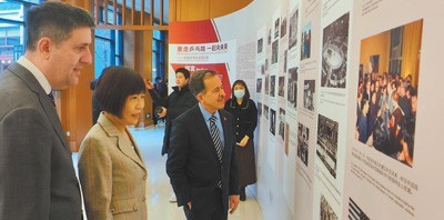 1月6日,弗吉尼亚大学代表团在清华大学参观中美“乒乓外交”图片展。