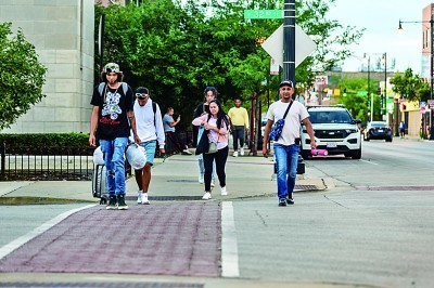 2023年8月17日,在美国芝加哥街头拍摄的由得克萨斯州移送来的移民。新华社发