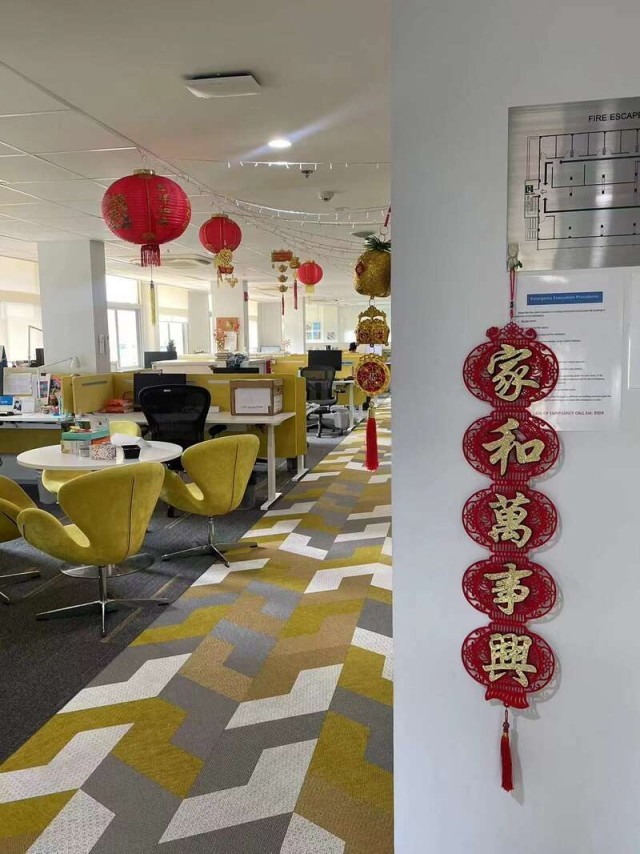 为了庆祝农历龙年春节,陈昱方的同事们早有准备。“从一个月前,同事们早早就在办公室装饰上了灯笼和春联,这让我感到非常亲切和感动。”陈昱方所在的部门只有两名中国员工,其他同事来自北美、南美、欧洲、泰国等地区和国家,但在龙年春节,同事们在开会前会互相祝福龙年快乐,也会在群聊里分享自己身穿“中国红”的照片。
