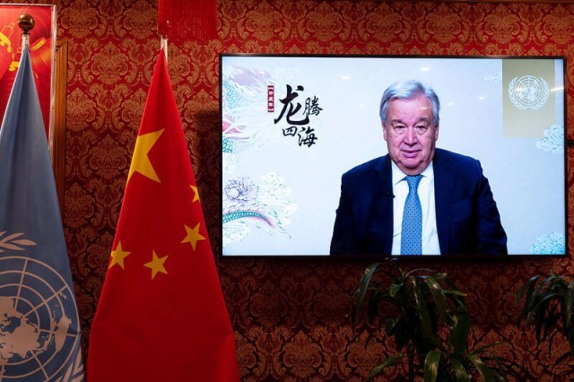 2月6日,美国纽约,联合国秘书长古特雷斯通过视频发表新春致辞,向中国人民和全球华人致以农历甲辰龙年的祝福和问候。图为中国常驻联合国代表团纽约驻地的屏幕播放致辞。视觉中国供图