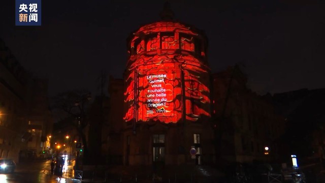 近日,法国吉美国立亚洲艺术博物馆外墙上,由灯光投影出龙的形象。在朵朵红色祥云中,墙上还打出了法语版春节祝福语。