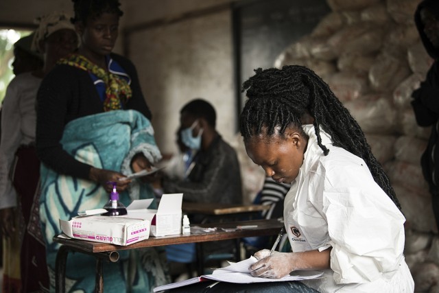 当地时间2023年3月16日,莫桑比克遭受热带气旋弗雷迪破坏,一名卫生工作者(右)记录当地病人的详细信息。