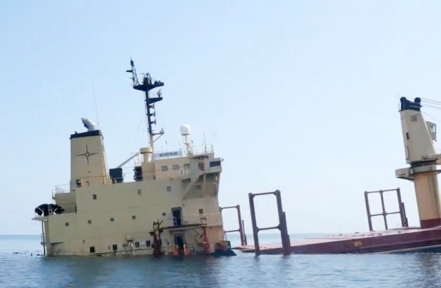 这张拍摄日期不明的照片显示了英国货轮“鲁比马尔”号沉没前的景象。新华社发(也门政府供图)