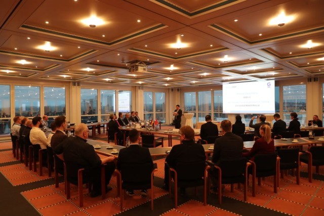 这是1月22日在德国贝库姆市伯曼集团总部拍摄的落户太仓第500家德企授牌仪式现场。中国江苏省太仓市22日在德国北威州贝库姆市为落户的第500家德企伯曼集团举行授牌仪式。新华社记者杜哲宇摄