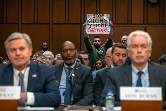 3月11日,美国华盛顿特区,美国参议院情报委员会炒作“中俄威胁”,台下再现反战抗议。图为美国联邦调查局局长克里斯托弗·雷(左)和中央情报局局长威廉·伯恩斯参加听证会。视觉中国供图