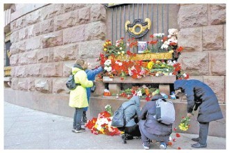 图为3月23日,在俄罗斯圣彼得堡,市民献花悼念莫斯科近郊恐袭事件遇难者。 新华社发