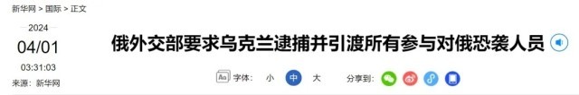 俄罗斯外交部3月31日发表声明,要求乌克兰逮捕并引渡所有参与对俄恐怖袭击的人员。