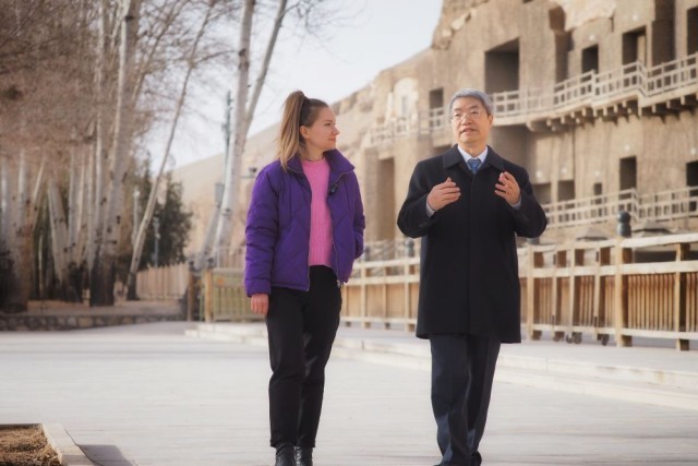 3月16日,新华社外籍记者达莎在莫高窟前同敦煌研究院党委书记赵声良交流。新华社记者赵宇摄