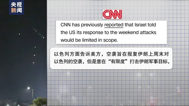 总台记者 赵兵:根据以色列当地媒体援引以色列多位安全人士的话称,在19日凌晨,以色列使用无人机和远程导弹对伊朗以及叙利亚境内目标实施了报复性的袭击,以此释放出一个信号,就是只要伊朗对以色列发动袭击,以色列就有对伊朗本土实施打击的能力。根据当地媒体披露的信息,此前以色列已经在18日通知美国政府,计划近两天内对伊朗作出回应。