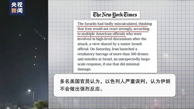 《纽约时报》写道,“多名美国官员认为,以色列人严重误判,认为伊朗不会做出强烈反应。” 《纽约时报》认为,伊朗此举“清楚地表明,近几个月来,以色列和伊朗之间酝酿已久的不成文交战规则发生了巨大变化。”