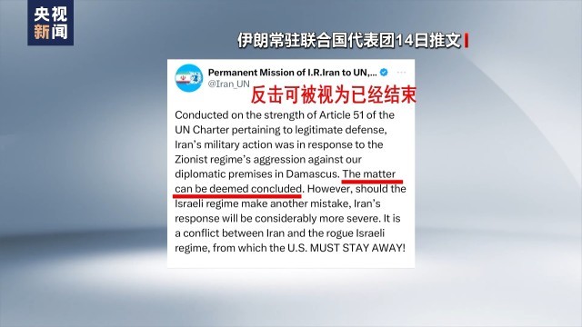 另一方面,伊朗的行动也是相对克制。虽然伊朗此前高调誓言报复,但实际发动对以袭击却已是“炸馆”事件两周以后。事后伊朗常驻联合国代表团也很快通过社交媒体表示,伊朗的“合法”反击目前“可被视为已经结束”。此外,伊朗方面还表示,已提前多日预警。