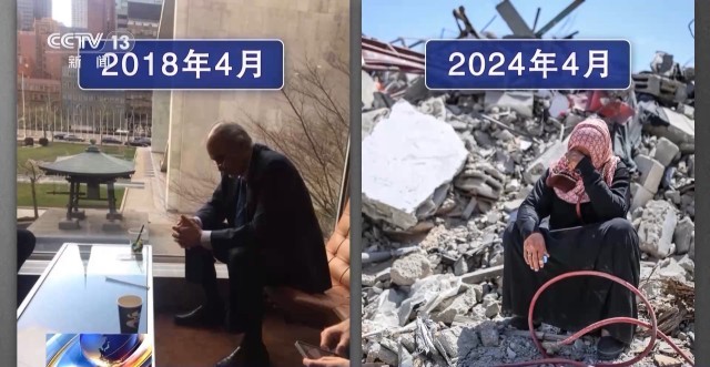 加沙地带民众的命运不掌握在自己的手上。不禁让人想起了几年前的叙利亚。来看一张照片,这是叙利亚前驻联合国代表巴沙尔·贾法里。整整六年前,也就是2018年4月,尽管贾法里在联合国据理力争仍然无法阻止美英法对叙利亚发动空袭。