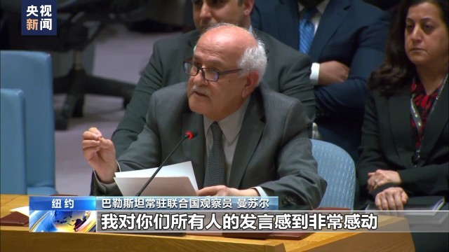 巴勒斯坦常驻联合国观察员 曼苏尔:我对你们所有人的发言感到非常感动,不管是投票赞成的,甚至还有不这么投的。你们的承诺中充满了激情,理解当下巴勒斯坦人民的痛苦,我向你们致敬,以巴勒斯坦人民的名义,以及巴勒斯坦领导人名义。