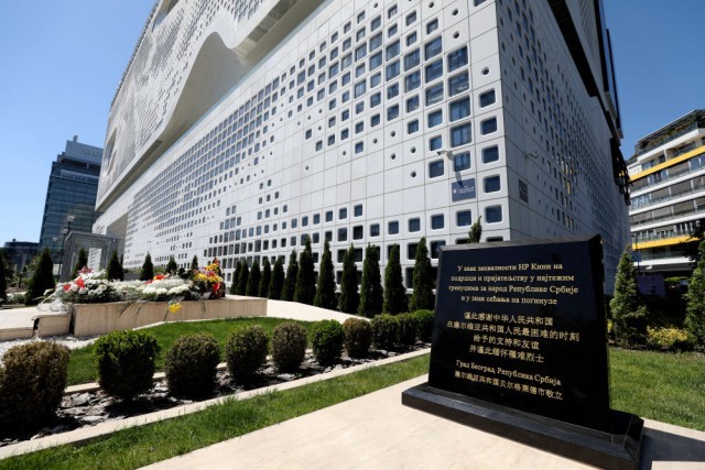 2024年4月28日在塞尔维亚首都贝尔格莱德拍摄的贝尔格莱德中国文化中心大厦前的纪念碑。