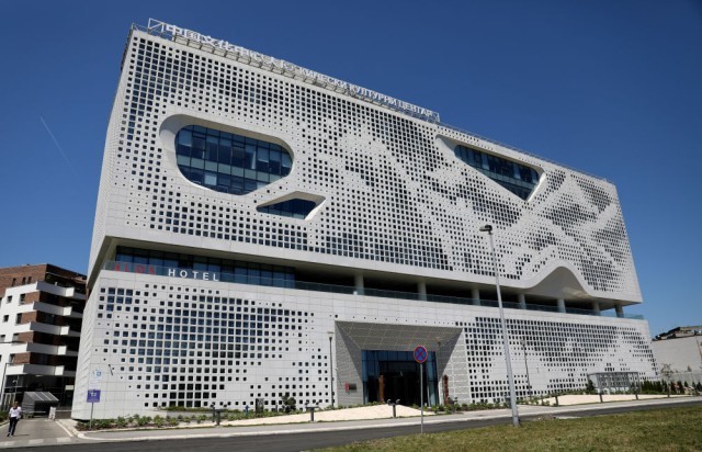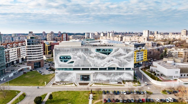 2024年4月28日在塞尔维亚首都贝尔格莱德拍摄的中国文化中心。建筑外立面通过精巧的设计,融入了中国山水画理念。