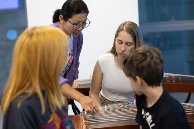 2024年4月29日,在贝尔格莱德中国文化中心,古筝指导老师王宣(后左)在教学。