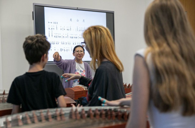 2024年4月29日,在贝尔格莱德中国文化中心,古筝指导老师王宣(后)在教学。
