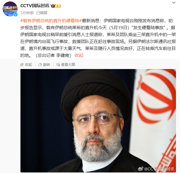 伊朗国家电视台刚刚发布消息称,初步报告显示,载有伊朗总统莱希的直升机今天(5月19日)“发生硬着陆事故” 。据伊朗国家电视台稍早前援引消息人士报道称,莱希及团队乘坐三架直升机中的一架在伊朗境内出现飞行事故,救援团队正在赶往事故现场。