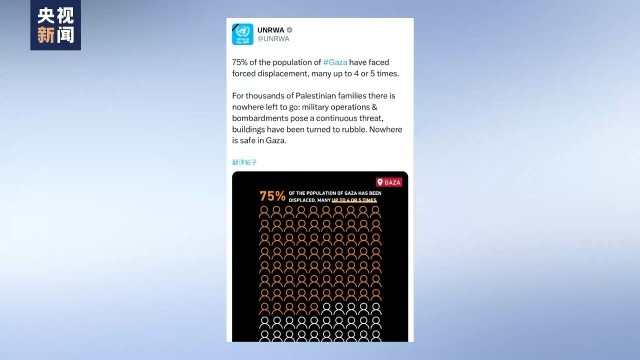 联合国近东巴勒斯坦难民救济和工程处(近东救济工程处)22日发文说,75%的加沙地带民众被迫流离失所,其中许多人已经反复失去安身之处多达四到五次。