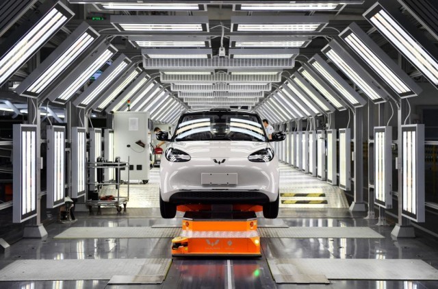 在广西柳州市上汽通用五菱精益智造工厂拍摄的等待下线的整车(5月9日摄)。新华社记者金皓原摄
