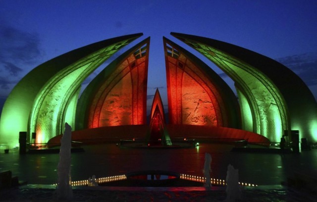 2023年7月29日,巴基斯坦首都伊斯兰堡的巴基斯坦纪念碑亮起中巴两国国旗颜色的灯光,庆祝中巴经济走廊启动十周年。新华社发