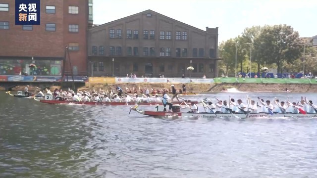 总台记者 余鹏:现在在我身后的,是德国杜伊斯堡趣味龙舟赛。龙舟上传来鼓声阵阵,运动员们飞桨逐浪、奋勇争先。岸边围满了加油助威的观众,人们尽情享受比赛带来的激情,这场龙舟赛也变成了老少皆宜的聚会。