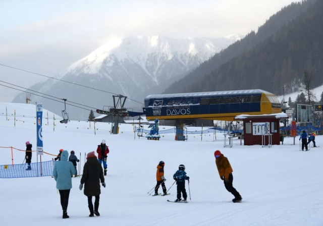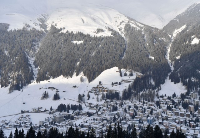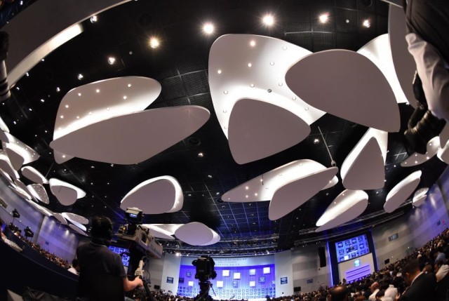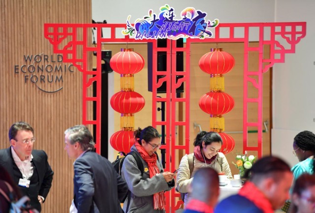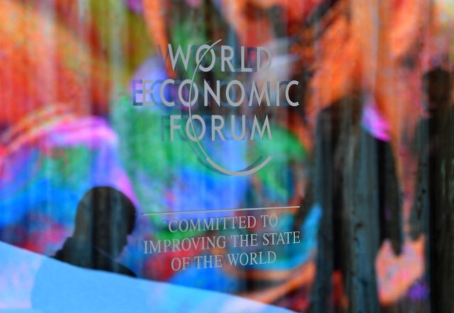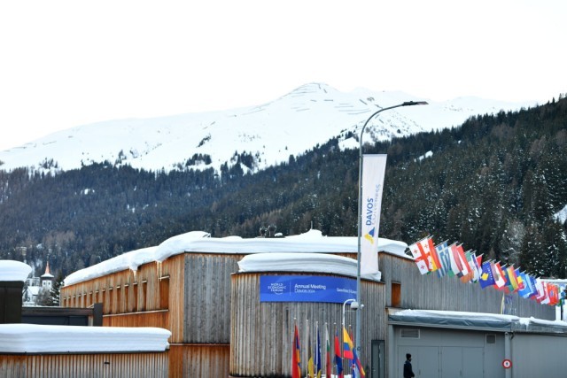 ↑在瑞士达沃斯拍摄的世界经济论坛标识。