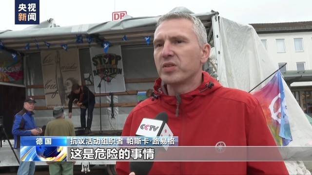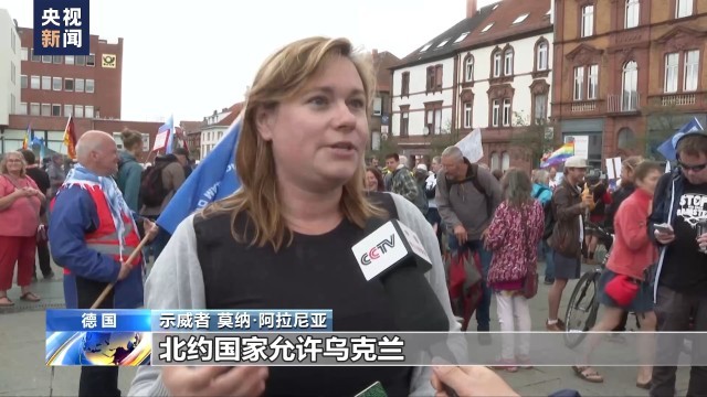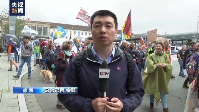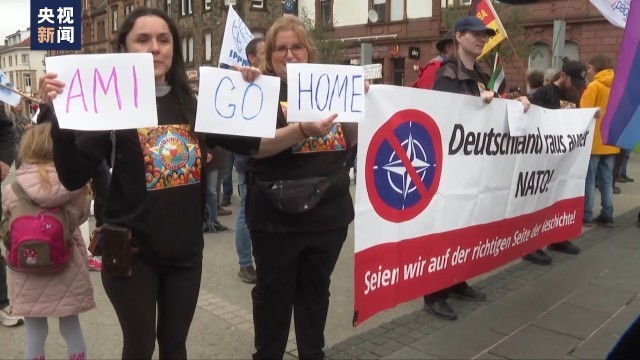 总台记者 余鹏:现在,抗议民众正在凯泽斯劳滕市中心游行,他们手举着停止拉姆斯泰因空军基地、停止战争等标语,抗议美国利用德国领土发起战争行为,要求美国军队撤出德国。
