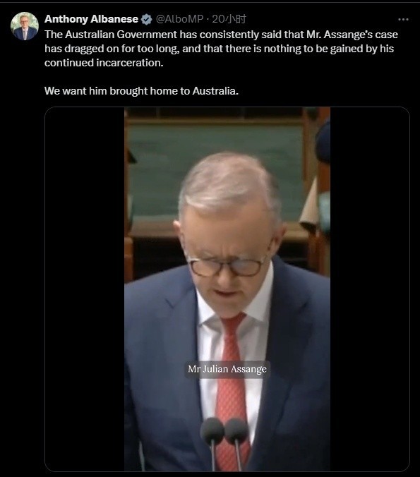 △澳大利亚总理阿尔巴尼斯25日在社交媒体就阿桑奇案发文