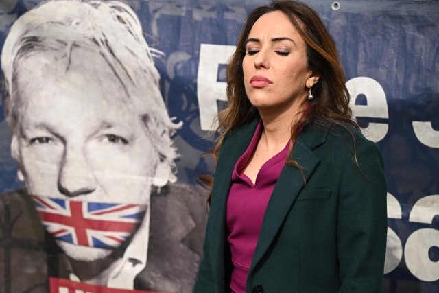 △阿桑奇的妻子斯特拉站在挂着阿桑奇的海报前(资料图)