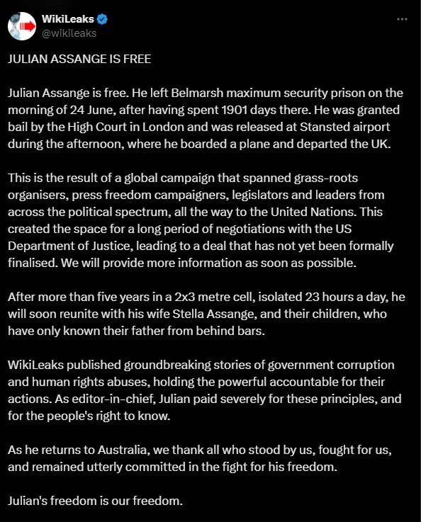 5年后的2024年6月24日上午,阿桑奇重获自由,离开贝尔马什监狱,前往伦敦斯坦斯特德机场,并于当天下午乘机离开英国。阿桑奇搭乘飞机在经停泰国曼谷后,于26日抵达美属北马里亚纳群岛首府塞班岛,在完成相关法庭程序后,将由澳大利亚驻英国大使陪同返回澳大利亚。