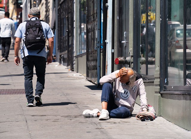 在美国加州旧金山市区街道上拍摄的无家可归者(右)(2023年8月18日摄) 李建国摄/本刊