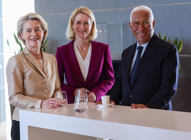 当地时间2024年6月28日,比利时布鲁塞尔,欧盟峰会结束一天后,欧盟委员会主席冯德莱恩(左)、爱沙尼亚总理卡拉斯(中)和葡萄牙前总理安东尼奥·科斯塔(右)在布鲁塞尔机场会面。