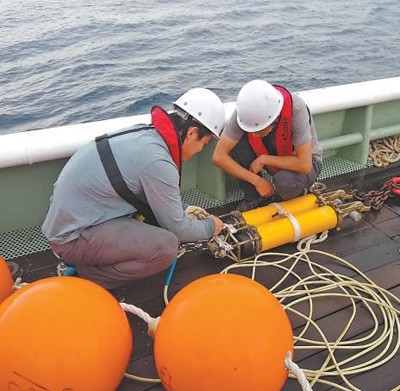 中泰联合例行海洋调查期间,科研人员准备部署海洋浮标系统。
