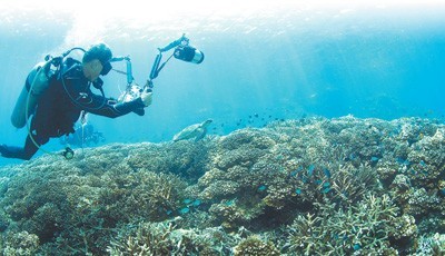 在马来西亚热浪岛,中国自然资源部第三海洋研究所和马来西亚马来亚大学共同开展海洋生态联合调查与研究。图为科研人员记录海底珊瑚礁状况。