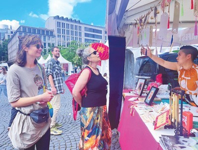 8月2日至4日,第四届法兰克福中国节在德国法兰克福市举行。图为当地市民和游客在欣赏中国手工艺品。本报记者 刘 赫摄