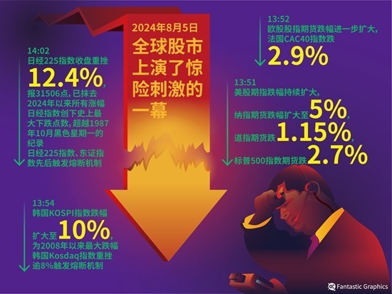 8月5日,多国股市遭遇“黑色星期一”:从日本到韩国,再到印度、新加坡、澳大利亚等国,多个主要市场均出现大幅下跌。日本股市成为亚太市场的“重灾区”,日经225指数跌幅一度超12%,仅一日便抹去2024年以来所有涨幅。韩国综合指数同样触发熔断,暴跌逾9.5%,创史上第四大单日跌幅。