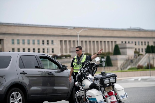 2021年8月3日,一名警察在美国弗吉尼亚州阿灵顿的五角大楼附近执勤。新华社记者刘杰摄