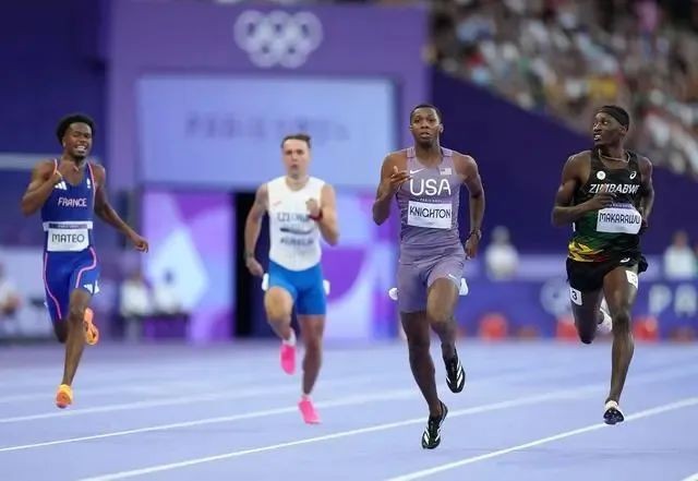 2024年8月5日,美国选手奈顿(右二)在比赛中。当日,巴黎奥运会田径男子200米第一轮比赛在法兰西体育场举行。新华社记者吕小炜 摄