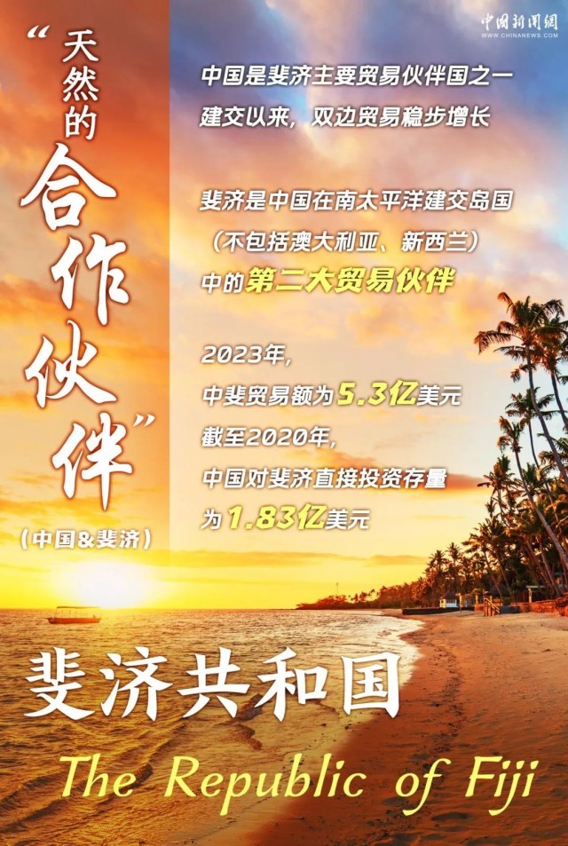 1975年11月5日,中国同斐济建交。斐济是太平洋岛国中经济实力较强、经济发展较好的国家。建交以来,双边贸易稳步增长。2023年,中斐贸易额为5.3亿美元。
