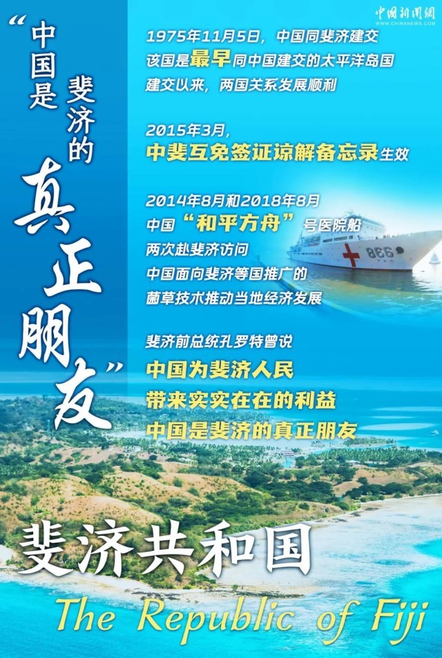 斐济是最早同中国建交的太平洋岛国。中斐建交以来,两国关系历久弥新,各领域交流合作成果丰硕。作为天然的合作伙伴、可靠的真正朋友,中斐两国携手共进,带来更多发展机遇。