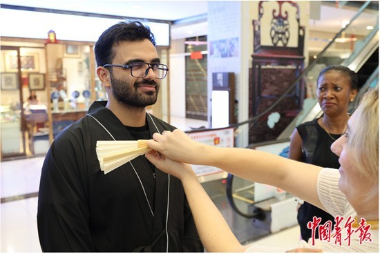 8月14日,湖南长沙,在欣赏川剧变脸后,来自伊拉克的艾哈迈德·法提·艾哈迈德在朋友举着的折扇后模仿起了“川剧变脸”。中青报·中青网记者 傅瑞/摄