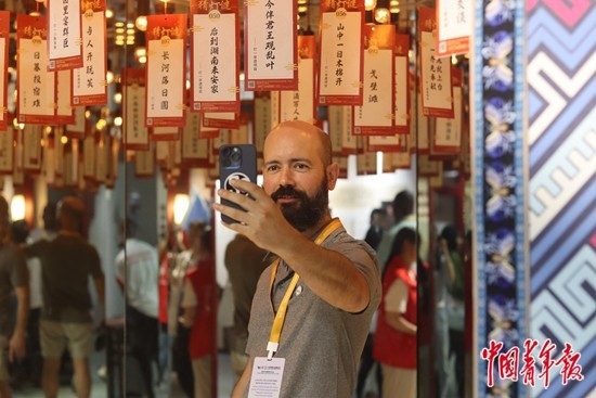 8月14日,湖南长沙,各国青年代表走进雨花非遗馆,了解并体验中国非遗民俗,来自美国的青年代表克里斯托弗·李·丹尼斯在灯谜展示区前拍照留念。中青报·中青网记者 余冰玥/摄