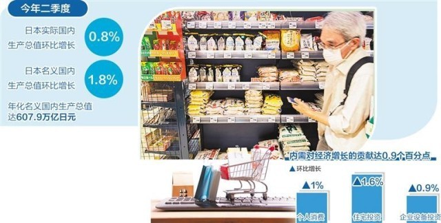8月15日,日本内阁府发布初步统计结果显示,今年二季度日本实际国内生产总值(GDP)环比增长0.8%,按年率计算增幅为3.1%。而名义GDP环比增长1.8%,按年率计算增幅为7.4%,年化名义GDP达607.9万亿日元,超过2015年安倍晋三内阁时期制定的600万亿日元目标。