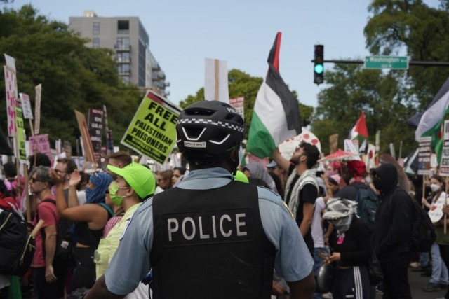 19日民主党全国代表大会开幕当天,数以千计支持巴勒斯坦的示威者在会场外游行。尽管示威活动事先得到警方许可并划定了游行路线,但一些示威者冲出规定路线,后与警察发生冲突。当天有13人被捕。20日,警方在重点区域的警戒线外加装了安全护栏。