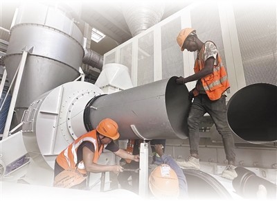 在科特迪瓦阿比让可可加工厂内,中科工作人员正在安装调试设备。